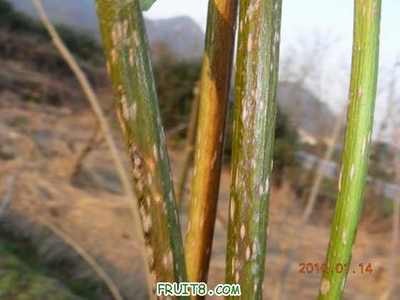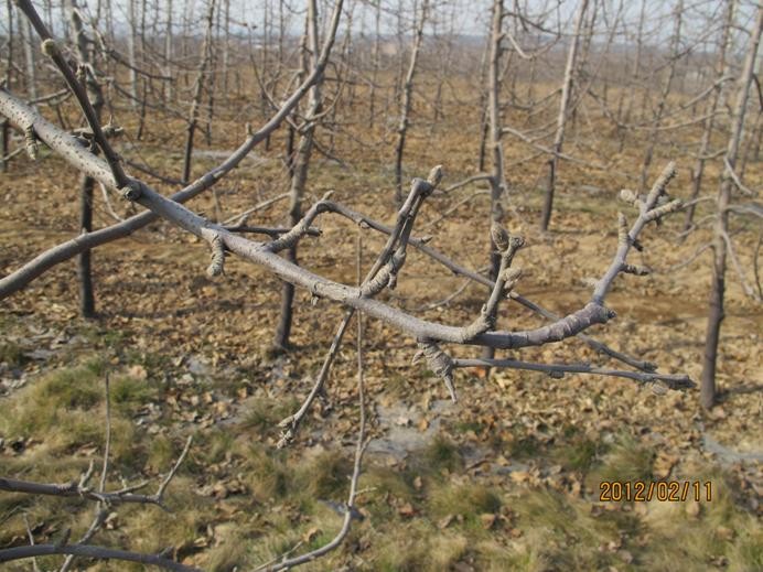 2.枝條:枝條的凍害與其成熟度有關(guān)。成熟的枝條在休眠期以形成層最抗寒,皮層次之,而木質(zhì)部、髓部最不抗寒;在生長期則相反,形成層抗寒力最差,入秋時未木質(zhì)化易受凍害。多年生枝條凍害表現(xiàn)為局部凍傷,受凍部分最初稍變色下陷,不易發(fā)現(xiàn)。如用刀切開,會發(fā)現(xiàn)韌皮部變褐;枝條凍傷處變褐后,從變褐部位以上的枝條逐漸干枯死亡。韌皮部裂開變褐脫落,但如果形成層未受凍則還可以恢復(fù)。特別是成熟不足的先端枝條對嚴(yán)寒敏感,常先發(fā)生凍害,輕者髓部變色,重者枝條脫水干縮甚至凍死。