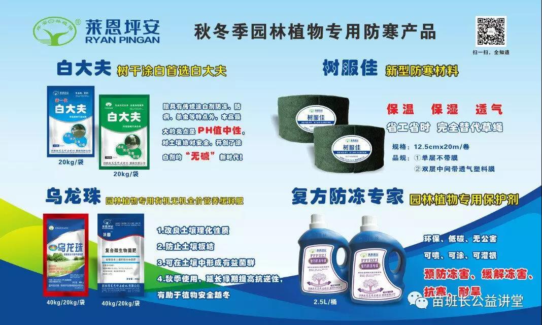 2、使用防凍劑:在低溫凍害之前人工噴灑具有一定功能的化學制劑。如坪安復方防凍專家。噴灑樹體后,能迅速在植物葉面和枝干表面形成一層保護膜,阻擋寒流、季風的襲擊,提高植物抗寒能力,減少風蝕造成的枝葉損傷。特別在寒流、季風來臨前使用。相當于及時給樹體穿上棉襖,起到保暖作用。大大提高植物抗凍能力。