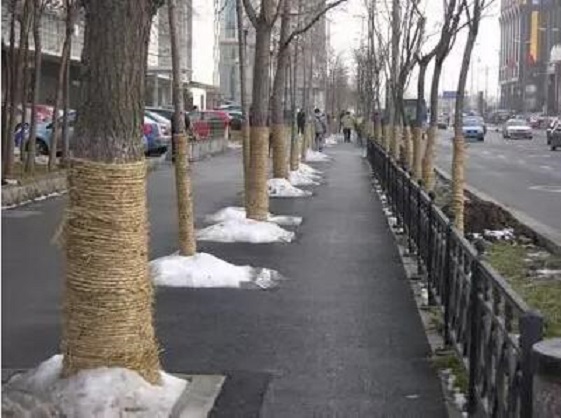入冬前用草繩、無紡布、尼龍布等材料樹木的主干及部分主枝包起,主干卷干高度不低于分枝點高度的三分之二。
