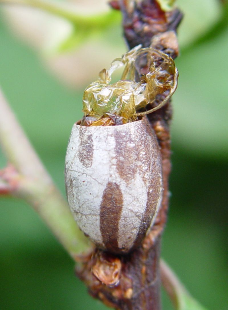 蛹:長(zhǎng)11~13毫米,橢圓形,肥大,黃褐色。繭石灰質(zhì)堅(jiān)硬,橢圓形,繭上有數(shù)條灰白色與褐色相間的縱紋,似麻雀蛋,緊貼于枝干上。