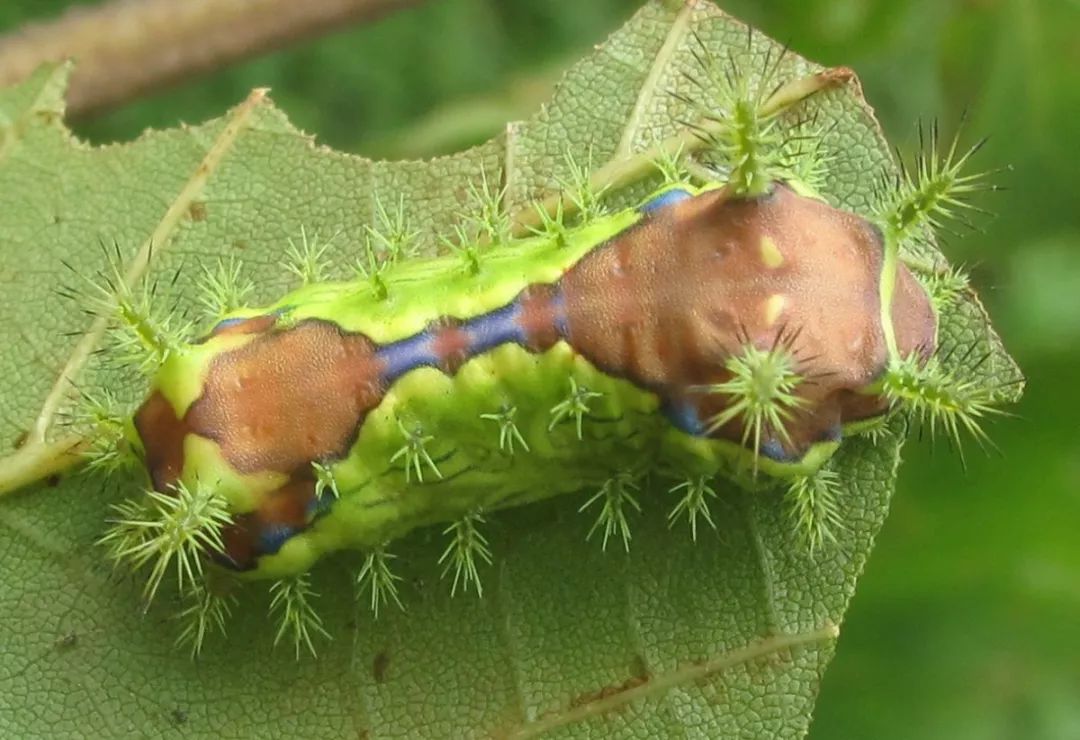 刺蛾類昆蟲屬鱗翅目、刺蛾科,為園林植物中較為常見害蟲。主要以幼蟲取食葉片、嫩梢為害。幼蟲呈蛞蝓形,體上常具有瘤和刺,被刺后可引起人和其實(shí)動(dòng)物皮膚痛癢,所以幼蟲又稱為癢辣子。蛹外具光滑、堅(jiān)硬的繭。刺蛾種類較多,為害園林植物的刺蛾害蟲主要有黃刺蛾、褐邊綠刺蛾、雙齒綠刺蛾、中國(guó)綠刺蛾、桑褐刺蛾等。