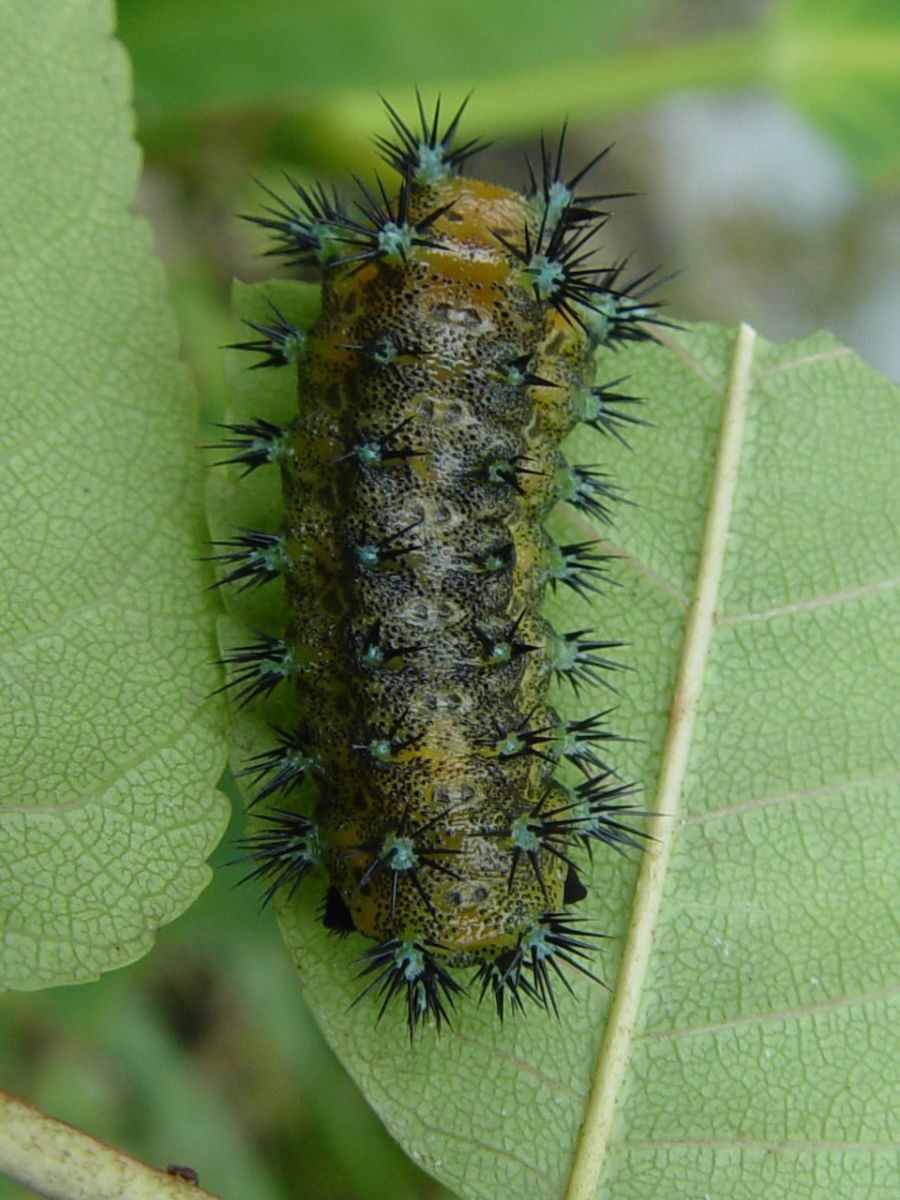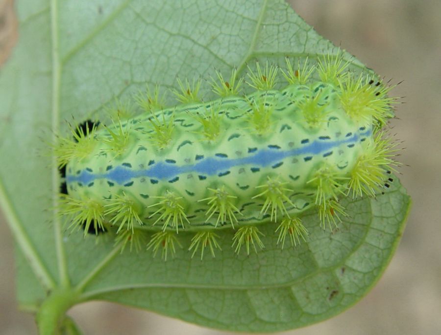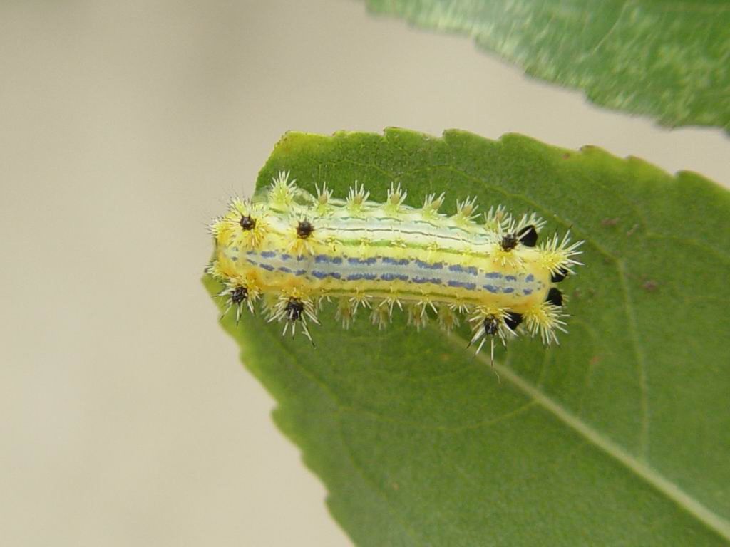 幼蟲:體長(zhǎng)15~20毫米,頭小,棕褐色,縮在前胸下面,體黃綠色,前胸盾具1對(duì)黑點(diǎn)。背線兩側(cè)具藍(lán)綠色點(diǎn)線及黃色寬邊,側(cè)線灰黃色較寬,具綠色細(xì)邊。節(jié)生灰黃色肉質(zhì)刺瘤1對(duì),以中后胸和8~9腹節(jié)的較大,端部黑色,第9、10節(jié)上具較大黑瘤2對(duì)。氣門上線綠色,氣門線黃色,各節(jié)體側(cè)也有1對(duì)黃色刺瘤,端部黃褐色,上生黃黑刺毛。腹面色較淺。
