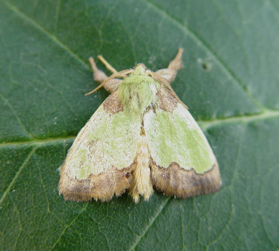 成蟲:體長(zhǎng)12毫米左右,翅展21~28毫米。頭頂和胸背面綠色,腹背灰褐色,末端灰黃色。觸角雄羽狀、雌絲狀。前翅綠色,基部灰褐色斑在中室下緣呈三角形,外緣灰褐色帶,向內(nèi)彎,呈齒形曲線;后翅灰褐色,臀角稍帶淡黃褐色。