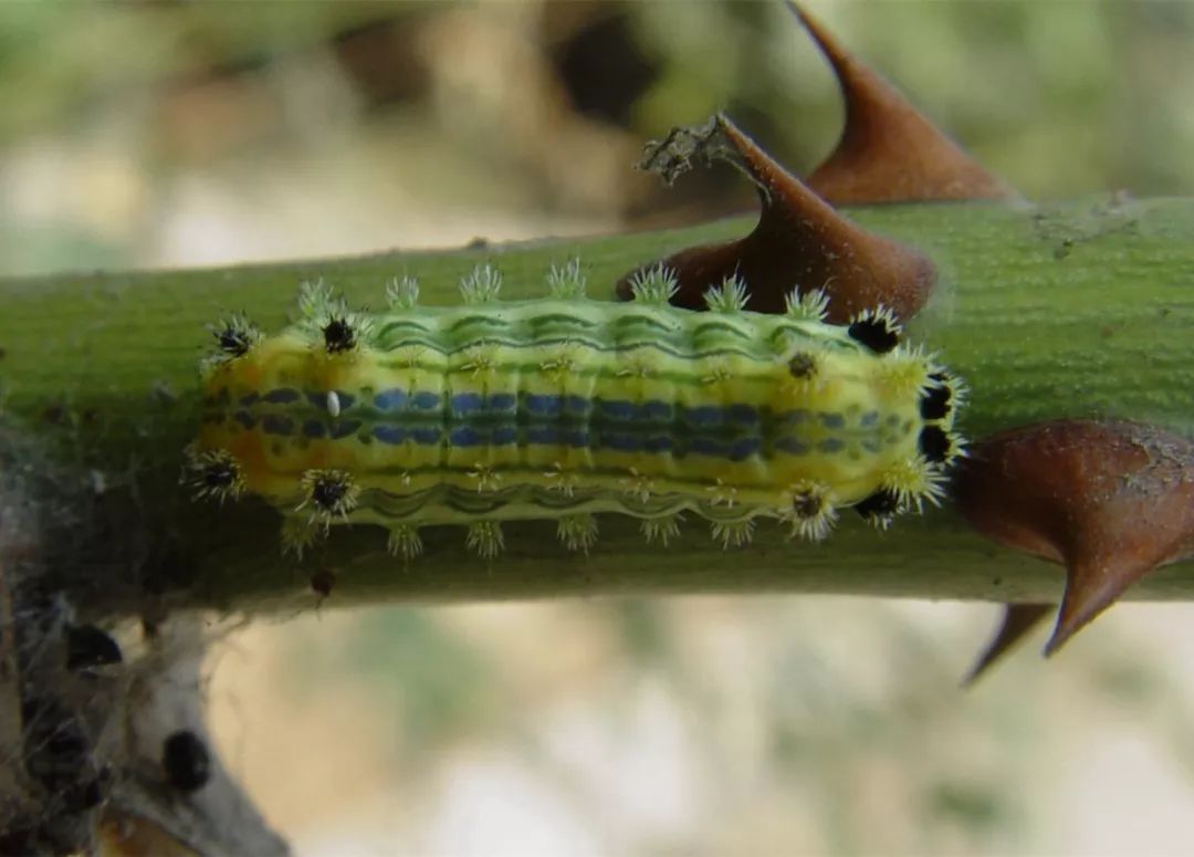 幼蟲:老熟幼蟲體長(zhǎng)25毫米左右,圓筒形,黃綠色;背線較寬,天藍(lán)色,每節(jié)每側(cè)黑點(diǎn)兩個(gè);亞背線和枝刺有黃色型和紅色型兩種;體側(cè)各節(jié)有天藍(lán)色斑1個(gè),鑲淡色黃邊,斑四角各有黑點(diǎn)1個(gè);中后胸和第4、7腹節(jié)背面各有粗大枝刺1對(duì),后胸至第8腹節(jié)每節(jié)氣門上著生長(zhǎng)短均勻的枝刺一對(duì),各枝刺有端部棕褐色的尖刺毛。