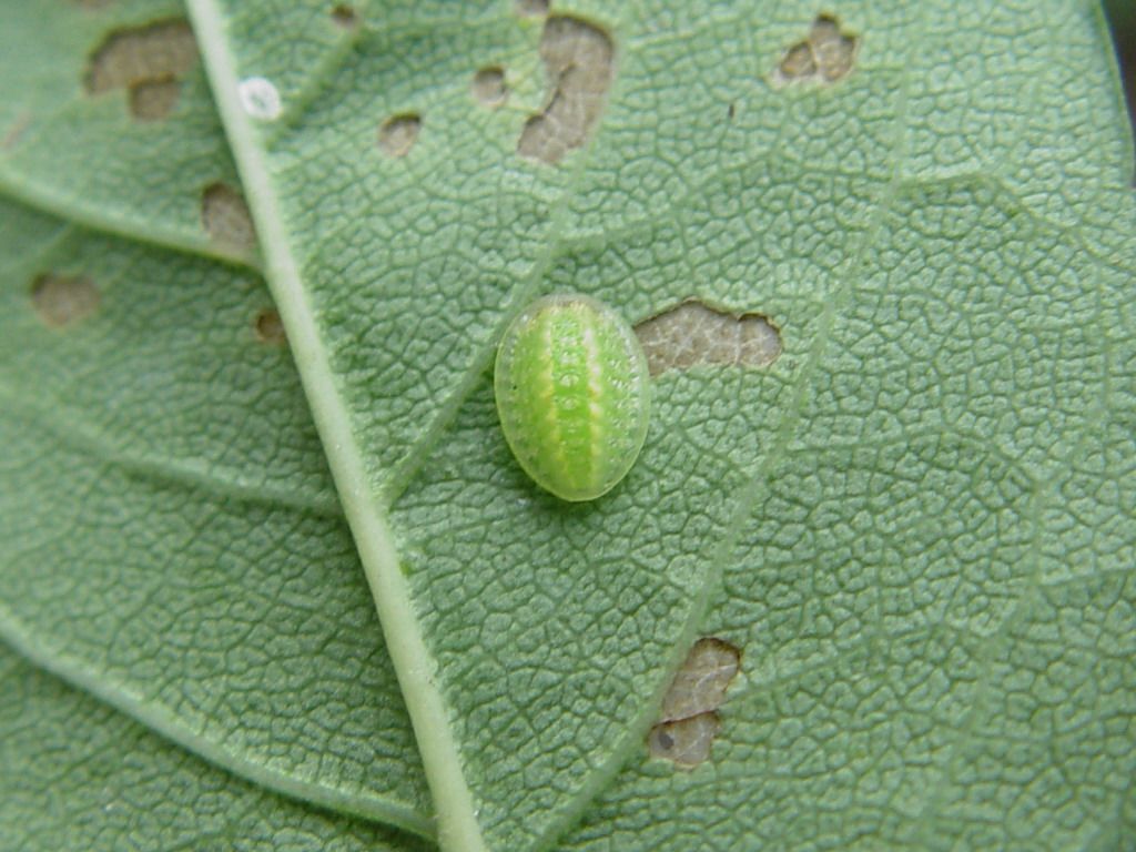 卵:橢圓形,扁平,長(zhǎng)徑1.4~1.5毫米,短徑0.9毫米。表面有線紋,初產(chǎn)時(shí)黃白,后變淡黃色。多產(chǎn)在葉面上,常成數(shù)十粒的卵塊。