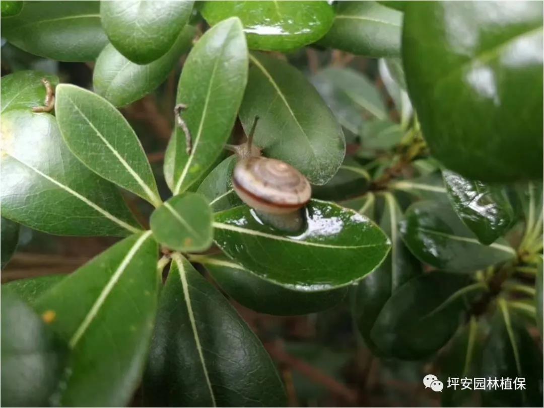 夏天雨后的清晨,在地上、草坪上、樹上均能看到這么一個小動物,它背著自己的小房子往前爬呀爬,在爬行的過程中還對我們的園林植物造成孔洞,缺刻,嚴重時則大面積光桿.