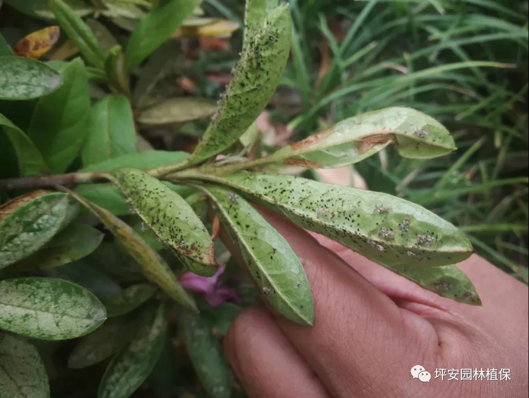 梨冠網(wǎng)蝽的成蟲、若蟲喜群集葉背主脈附近危害。被害處有許多斑斑點點的褐色糞便和產卵時留下的蠅糞狀黑點,造成花木整個受害葉片背面呈銹黃色,正面形成蒼白色斑點。受害嚴重時,葉片上斑點成片,全葉失綠呈蒼白色,提早脫落,嚴重影響植物的生長勢。