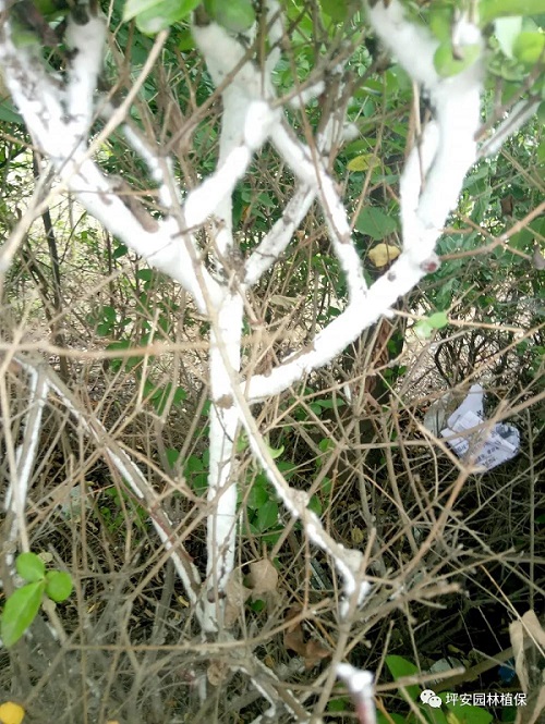 女貞白蠟蚧在女貞上的危害狀,嚴重時包裹整個枝干,造成樹勢衰弱干枯。