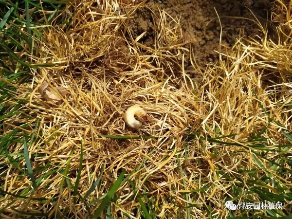 草坪遭受蠐螬危害后,根莖被咬斷,斷口整齊平截,嚴(yán)重時(shí)草坪大片枯黃。