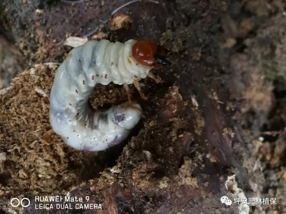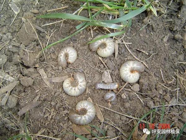 蠐螬又名核桃蟲,土蠶,是鞘翅目、金龜總科的幼蟲,是目前國內(nèi)公認(rèn)的難防治的土棲類害蟲。蠐螬乳白色,頭橙黃或黃褐色,體圓筒形,身體呈“C”形蜷曲,體長35-45mm,具3對(duì)胸足。背上多橫皺紋,尾部有刺毛,生活于土中。草坪遭受蠐螬危害后,根莖被咬斷,斷口整齊平截,嚴(yán)重時(shí)草坪大片枯黃,受害的地塊連年發(fā)生危害并逐年加重。