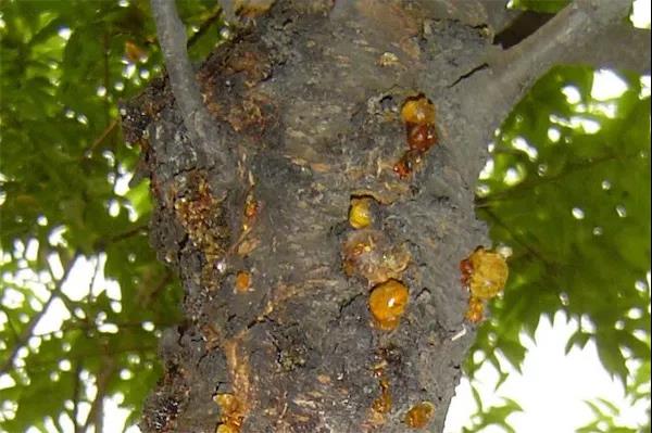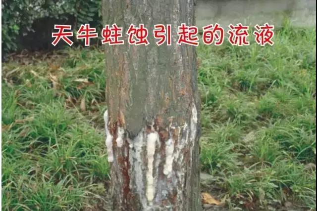 (1)修剪不當、蟲害蛀干、機械、人為等所造成的傷口 引發(fā)樹木流膠,以春季發(fā)生嚴重。