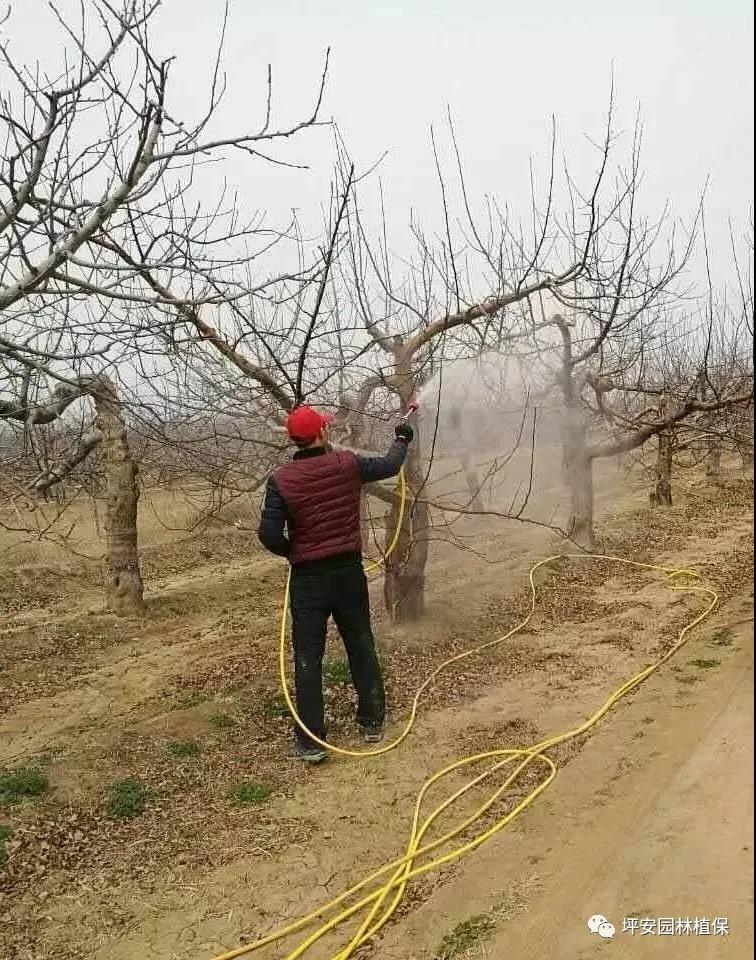 在冬季落葉后和春季萌芽前,樹體修剪后,選擇晴朗日子進行全園噴施一次觸殺性強的殺菌、殺蟲、殺螨劑,是非常必要的。石硫合劑是公認的清園神器,可在樹木的休眠期將29%石硫合劑稀釋50-100倍噴施在樹干和樹枝上,可起到強烈殺蟲、殺菌、殺螨的作用。