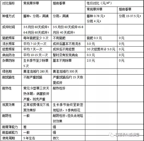 ①常規(guī)草坪草種植投入低,后期養(yǎng)護投入高;姬巖垂草種植投入較高,后期幾乎免養(yǎng)護無投入。