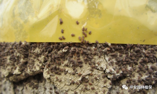 草履蚧若蟲沿樹干爬到小枝上汲取汁液,2月下旬大量上樹,3月中旬達(dá)到盛期。草履蚧若蟲和雌成蟲常成堆集合在嫩梢、葉片和枝干上,吮吸汁液,形成植株生長(zhǎng)不良。草履蚧若蟲出蟄后應(yīng)及時(shí)防治。