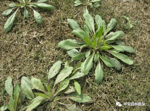 春季闊葉雜草的出苗和返青速度往往快于草坪的返青速度,待草坪返青后,雜草已明顯高于草坪草,牢牢占據(jù)生長優(yōu)勢,且點片狀發(fā)生,擴(kuò)繁力強,在局部草地中形成優(yōu)勢種,不僅破壞景觀效果,還易導(dǎo)致草坪逐漸退化。