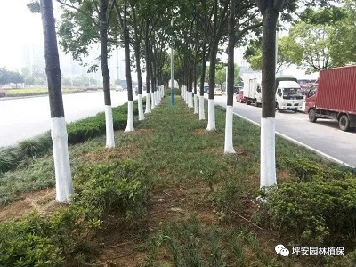 1、防凍防曬:樹干涂白后,可以增強樹干對陽光的反射能力,避免晝夜溫差過大,造成苗木的主干發(fā)生開裂。在秋冬時節(jié),樹木向陽面在白天受陽光照射,溫度上升,細胞解凍,夜晚溫度下降,又重新凍結;這樣一凍一化,就會使樹木皮部組織死亡,產生“日灼”崩裂現(xiàn)象。樹木涂白后,穿上了“保暖衣”,增加了樹干對陽光的反射能力,溫度變化比較平穩(wěn),可以減少凍害,防止“日灼”。
