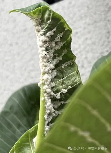 雞蛋花上的介殼蟲主要以桑白盾蚧和常春藤圓盾蚧為主,兼有扁平球堅(jiān)蚧等蚧殼蟲,均為刺吸式口器害蟲。其成蟲和若蟲群集在葉片、枝干上,以針狀口器插入葉片、枝干組織中吸取汁液,蟲體較多時(shí),密集重疊,枝條表面凹凸不平,造成枝葉枯萎、生長勢衰弱,甚至枝干及整株枯死。桑白盾蚧在雞蛋花上一般每年發(fā)生3-5代左右,第一代若蟲發(fā)生期為5月至6月中旬,第二代為6月下旬至7月中旬,第三代為8月下旬至9月中旬,第四代為10月下旬至11月中旬,以若蟲和雌成蟲群集固著枝干上刺吸汁液,樹體中上部、分杈處和陰面較多。
