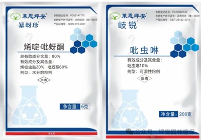 2.松大蚜危害期,其繁殖速度快,世代重疊多,用藥易產(chǎn)生抗性。使用化學(xué)藥劑防治時(shí),建議用復(fù)配藥劑或輪換用藥,可用80%烯啶·吡蚜酮水分散粒劑(暴蚜珍)1500倍液,10%吡蟲啉可濕性粉劑(萊恩坪安岐銳)500-750倍液,或22%噻蟲高氯氟(萊恩坪安瑞卡)1000倍液添加萊恩坪安礦物油混合液噴霧均可針對(duì)性防治 ,防治時(shí)建議在常規(guī)用藥基礎(chǔ)上縮短用藥間隔期,連用2-3次。