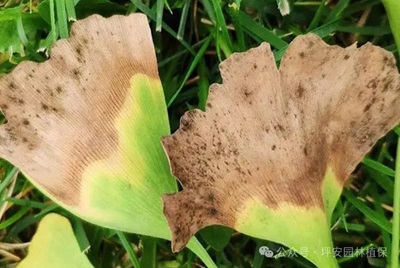 侵染的銀杏葉枯病,多發(fā)于5月至8月,屬真菌性病害。發(fā)病初期常見葉片尖端變黃,由局部擴展到整個葉緣,呈褐色至紅褐色的葉緣病斑。其后病斑逐漸向葉片基部蔓延,直至整個葉片變成褐色或灰褐色,枯焦脫落為止。