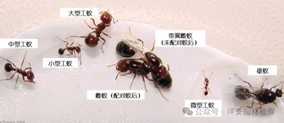 紅火蟻為地棲型蟻巢的螞蟻種類,筑巢于地下,營(yíng)社會(huì)性群居生活,包括有翅的雄蟻、有翅的雌蟻、蟻后及職蟻(工蟻及兵蟻)有翅型個(gè)體。一般每年春季3~5月、秋季9~11月為紅火蟻的活躍期,5—10月是紅火蟻發(fā)生的高峰期。其覓食的土壤表面溫度范圍為12-51℃,在氣溫高于21℃時(shí),覓食活動(dòng)較頻繁,生長(zhǎng)發(fā)育的最適溫度范圍為26-30℃。成熟的蟻群一年能產(chǎn)生4000~6000頭有翅生殖蟻。有翅生殖蟻在一年中的任何時(shí)間都可以進(jìn)行婚飛活動(dòng)。交配行為可能發(fā)生在90~300m的高空,一般交配1次。交配后的雄蟻很快死亡,雌蟻則隨風(fēng)飛行,尋找地點(diǎn)筑新巢。