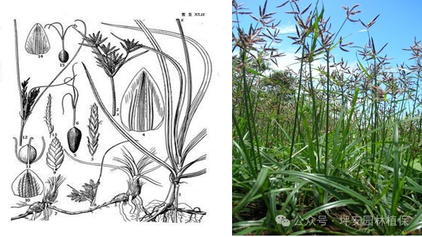 在北方園林中常見的莎草科雜草主要是香附子、而在南方比較常見主要是碎米莎草、水蜈蚣、異型莎草等。